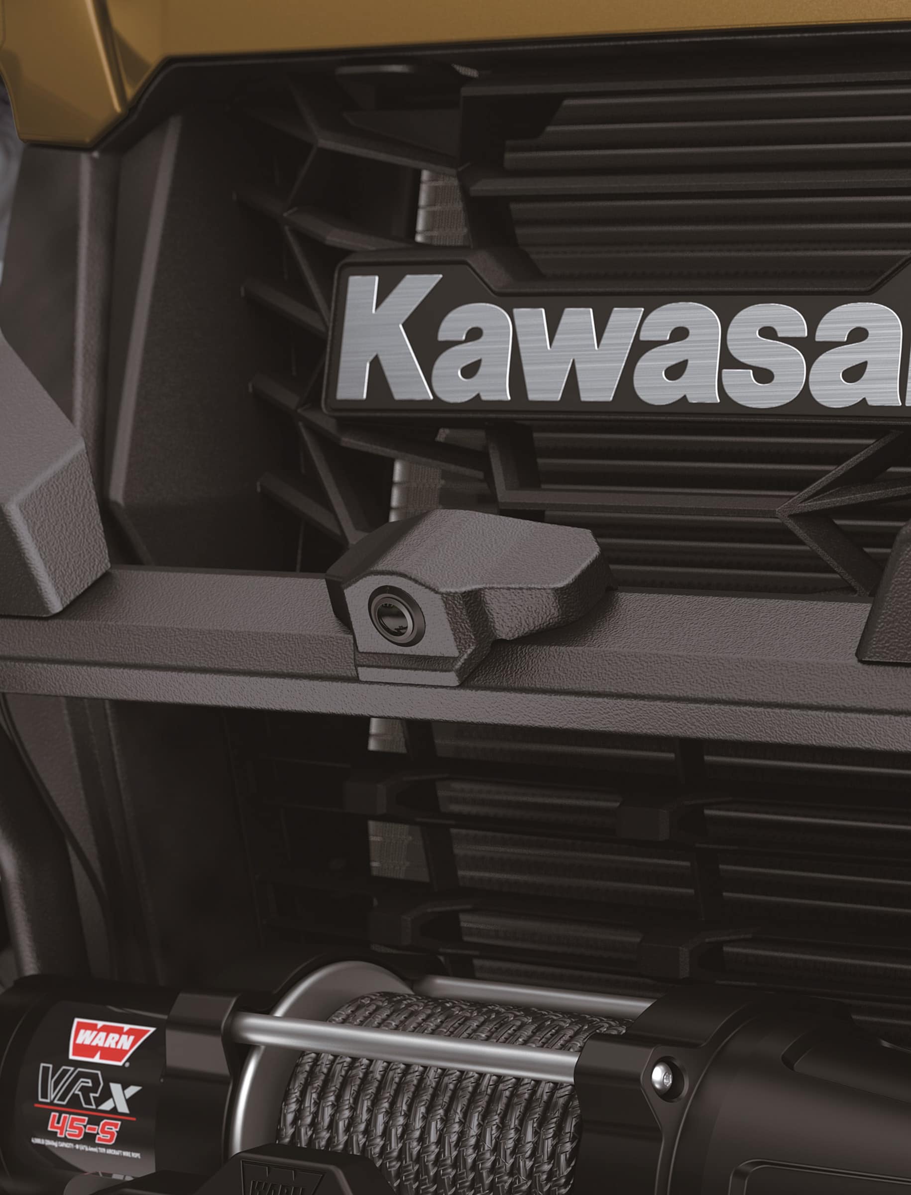 Bright LED headlights (48.6 W / 22.2 W) with line-type LED position lights contribute to the fierce expression, and an air-scoop built into the front hood adds to the aggressive, sporty image. The automotive-style front grille, complemented by a large aluminum Kawasaki emblem and a black-painted steel front bumper, enhances the vehicle’s tough looks. The bumper is matched by a high-quality black plastic cover, and the bumper shrouds with LED accent lights differentiate the RIDGE XR models, adding to their distinctive, sporty image. Painted fenders contribute to the car-quality fit and finish, and the front wheel wells beveled leading edge effectively deflects mud away from the body, ensuring cleanliness.