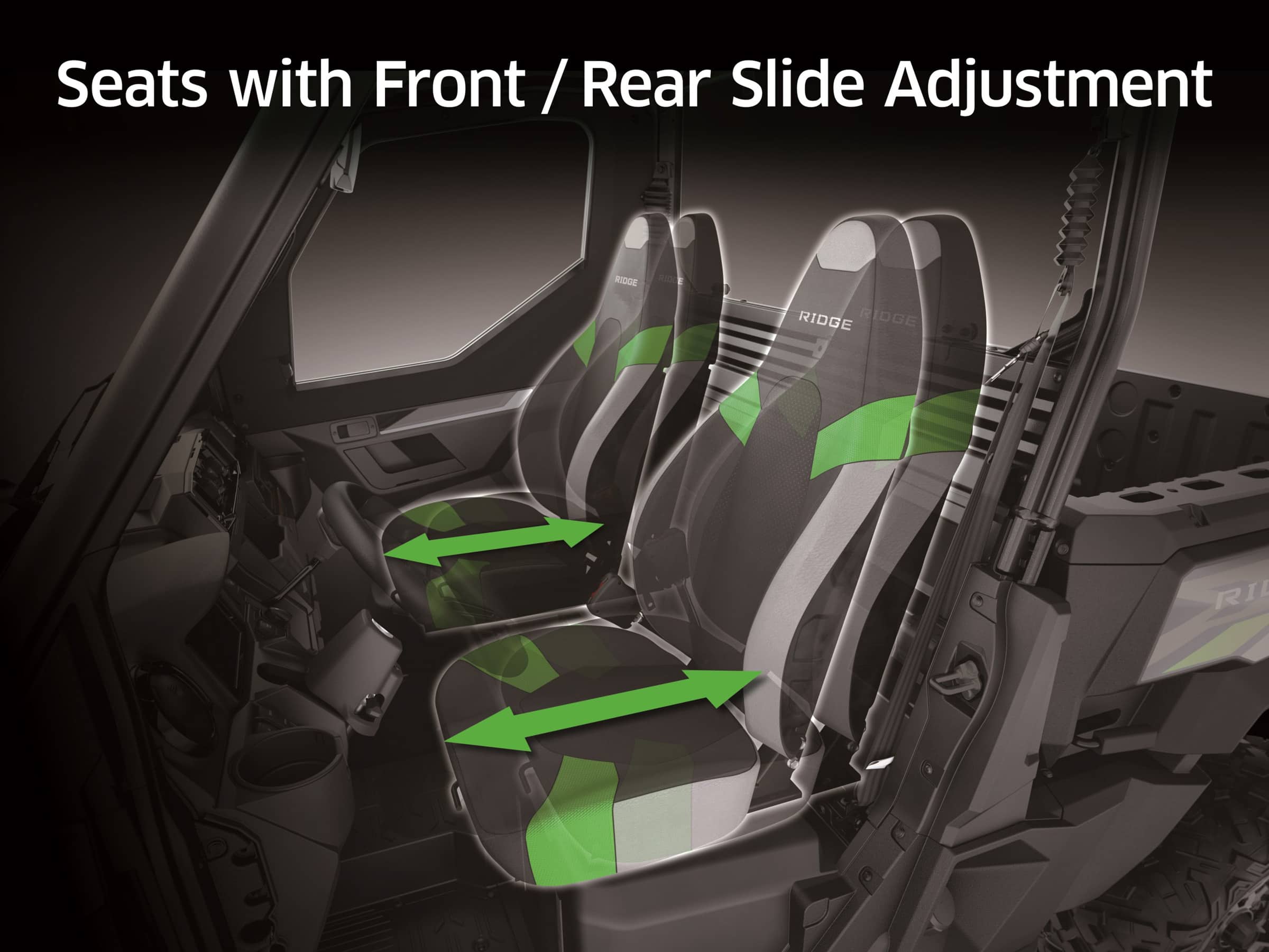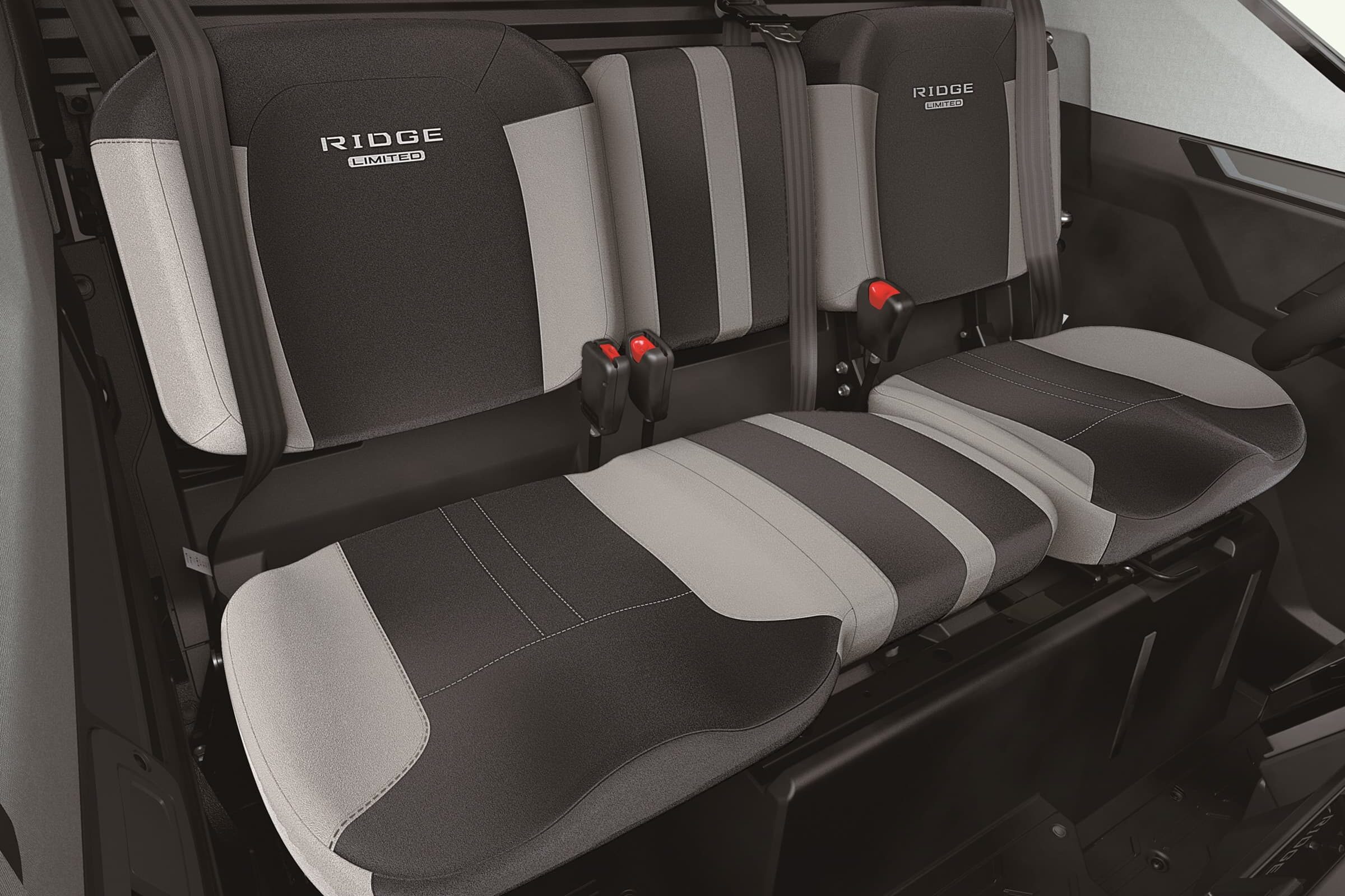 Step into the thoughtfully designed cab featuring a high-grade D-shaped steering wheel, an automotive-inspired dashboard, and a 7-inch TFT color instrument panel. Sink into plush, adjustable high-backed bucket seats with three-point seatbelts. Attention to detail shines through, from flat door handles maximizing interior space to carefully chosen textures on slip-resistant footrests. For the RIDGE® XR Deluxe side x side, contoured bench seating accommodates three adults, ensuring everyone enjoys the journey.