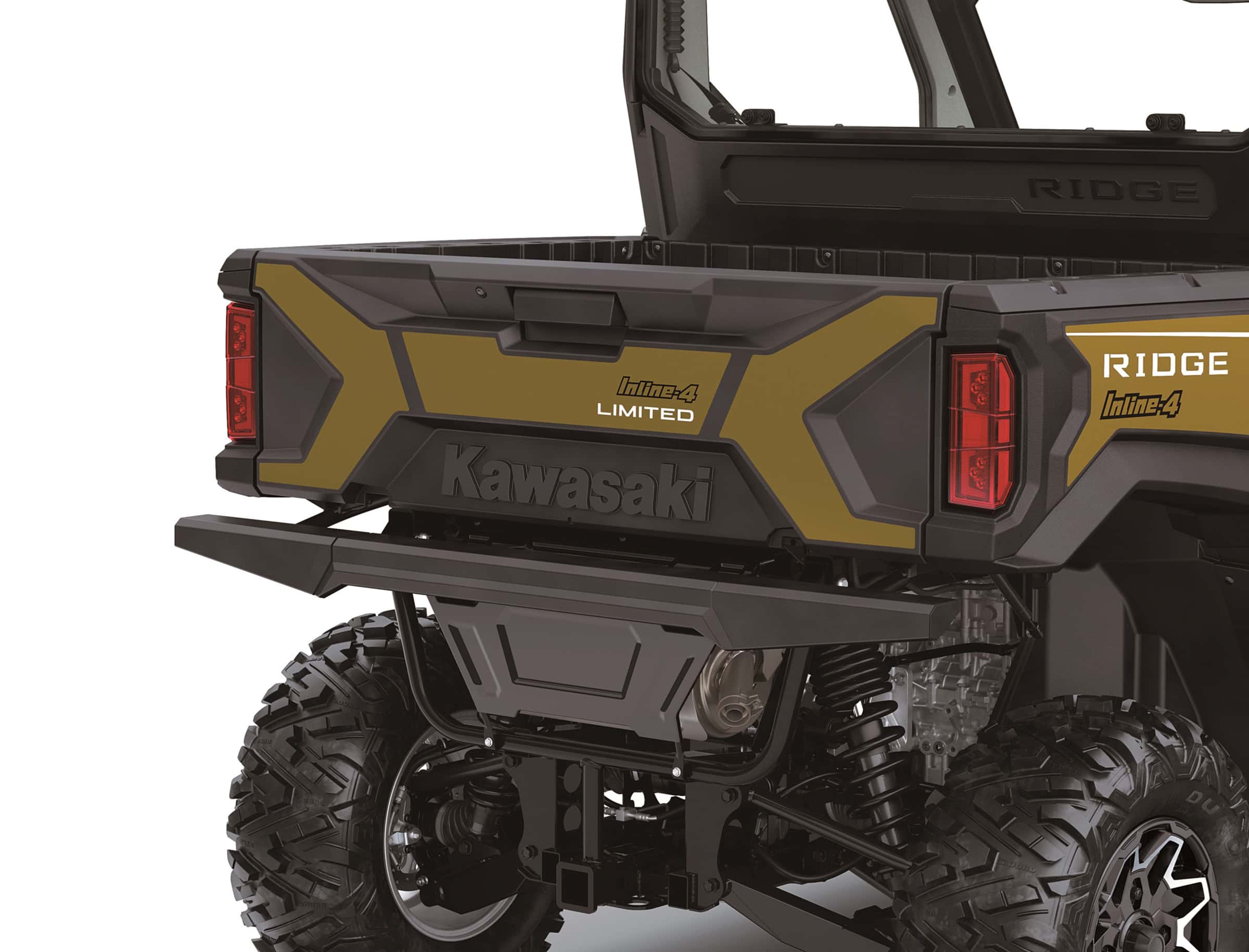The RIDGE boasts a premium exterior design to match its rugged, sporty styling, featuring painted fenders and all-LED lighting. The front headlights (48.6 W / 22.2 W) with line-type LED position lamps create a fierce expression, complemented by a large aluminum Kawasaki emblem on the front grille and a solid-looking steel front bumper. On the RIDGE® Limited, a painted rear bumper adds to the tough appearance from the rear. Painted fenders contribute to the car-quality fit and finish.