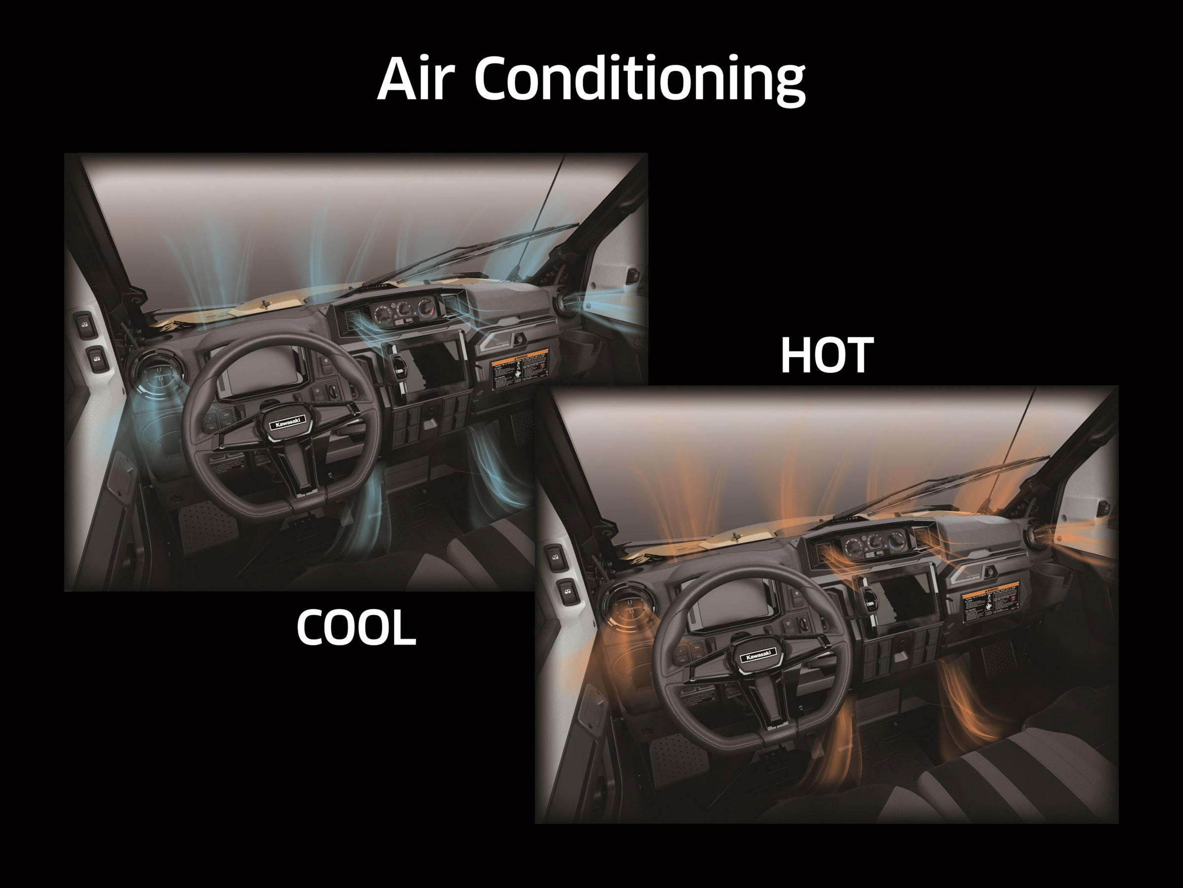 The wide space between the dashboard and seats allows easy movement through the cab and a standard plastic roof provides protection from the elements. High-grade fit and finish details, including floor lighting, backlit switches, and decorative components, contribute to the premium car-like interior. The high-grade automotive-style ignition key adds to the premium quality feel.