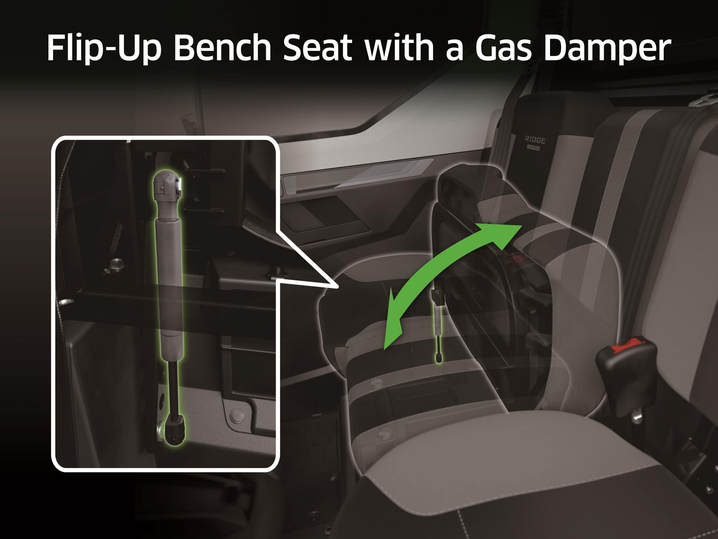 Underneath the passenger seats, storage space is available, and the center and right-side seats can be flipped up to facilitate the transportation of larger items beside the driver’s seat. A gas damper smoothens the movement of the seat, adding to the premium quality feel.