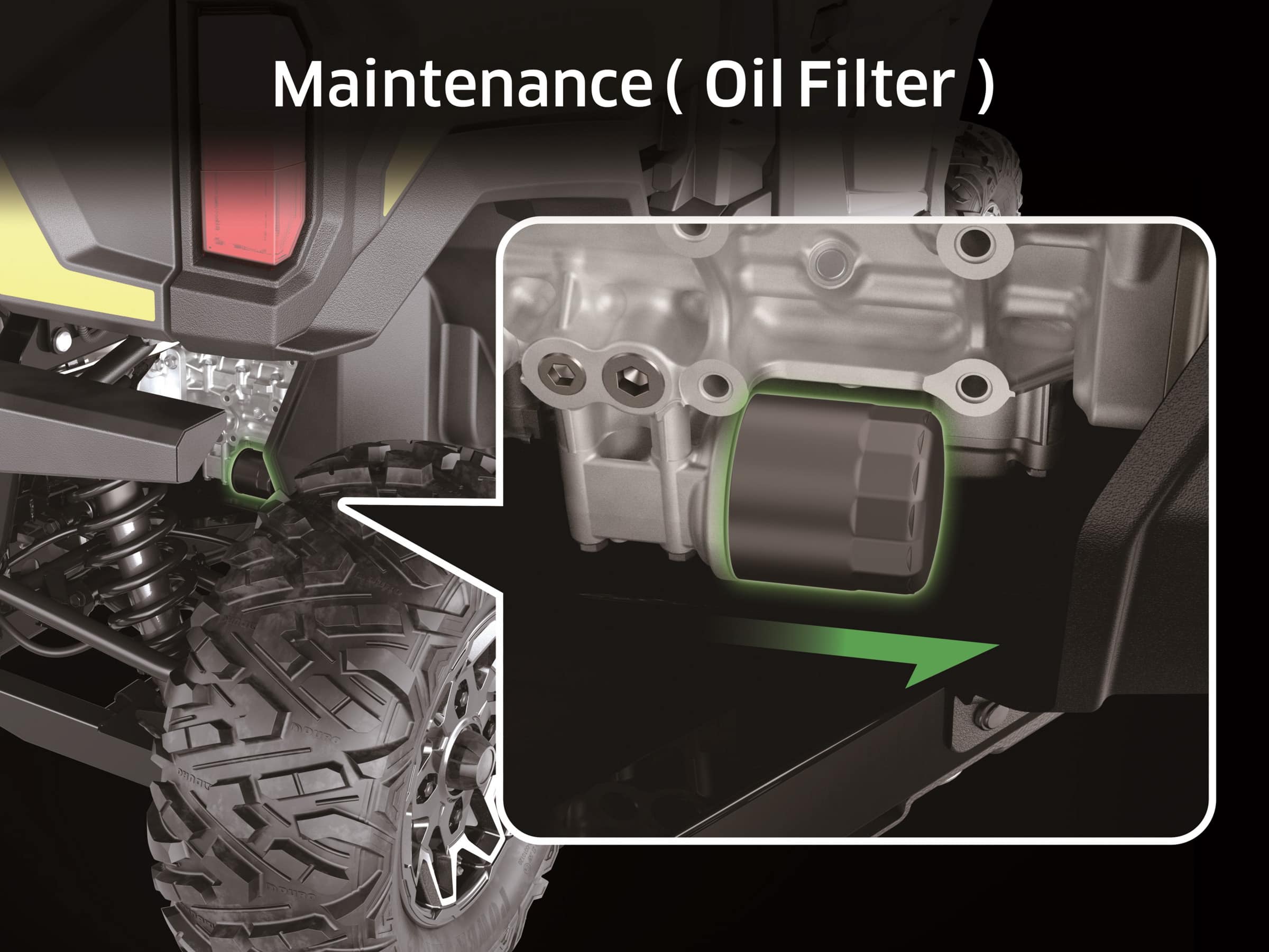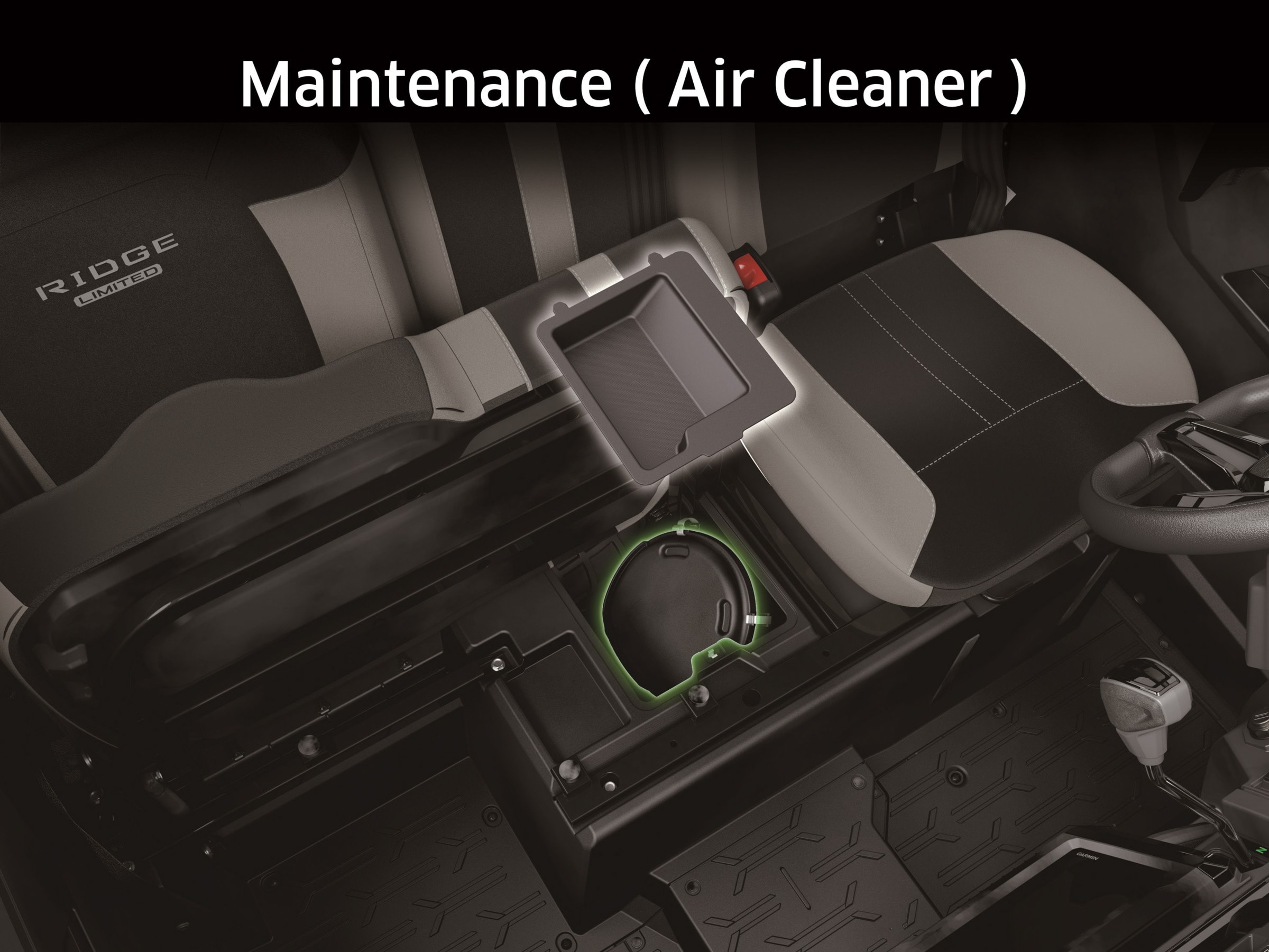 Routine maintenance is achieved with easily located oil and air filter locations; the oil filter is easily accessed by removing the fender panel forward of the rear wheel. The air filter on the RIDGE is located under the seat and can be accessed by lifting the passenger seat.