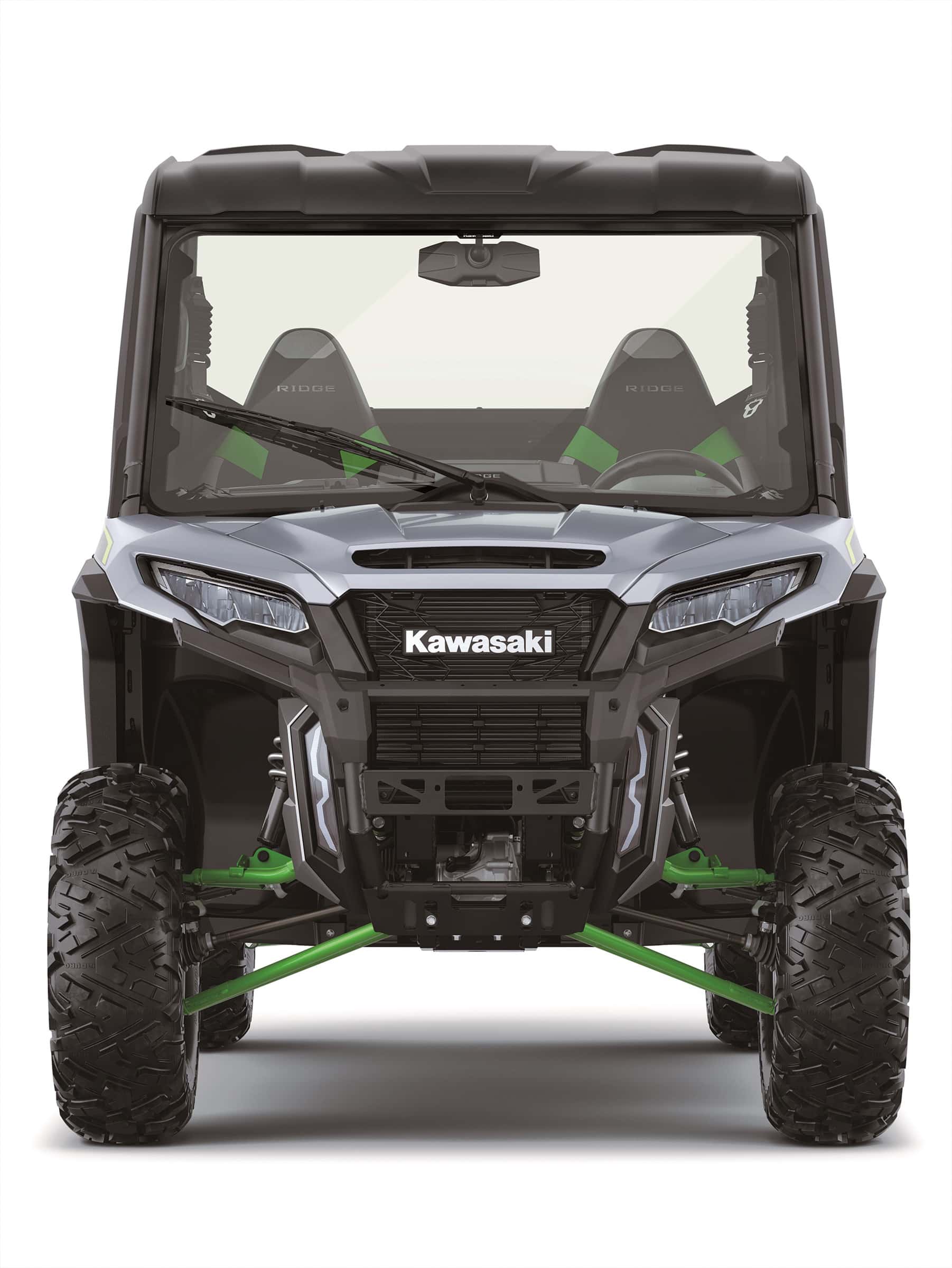 The RIDGE XR boasts a premium exterior design to match its sporty and tough styling, featuring painted fenders and all-LED lighting. The front headlights, equipped with line-type LED position lamps, create a fierce expression, complemented by a large aluminum Kawasaki emblem on the front grille, a light-looking steel front bumper, and LED accent lights on the bumper shrouds.