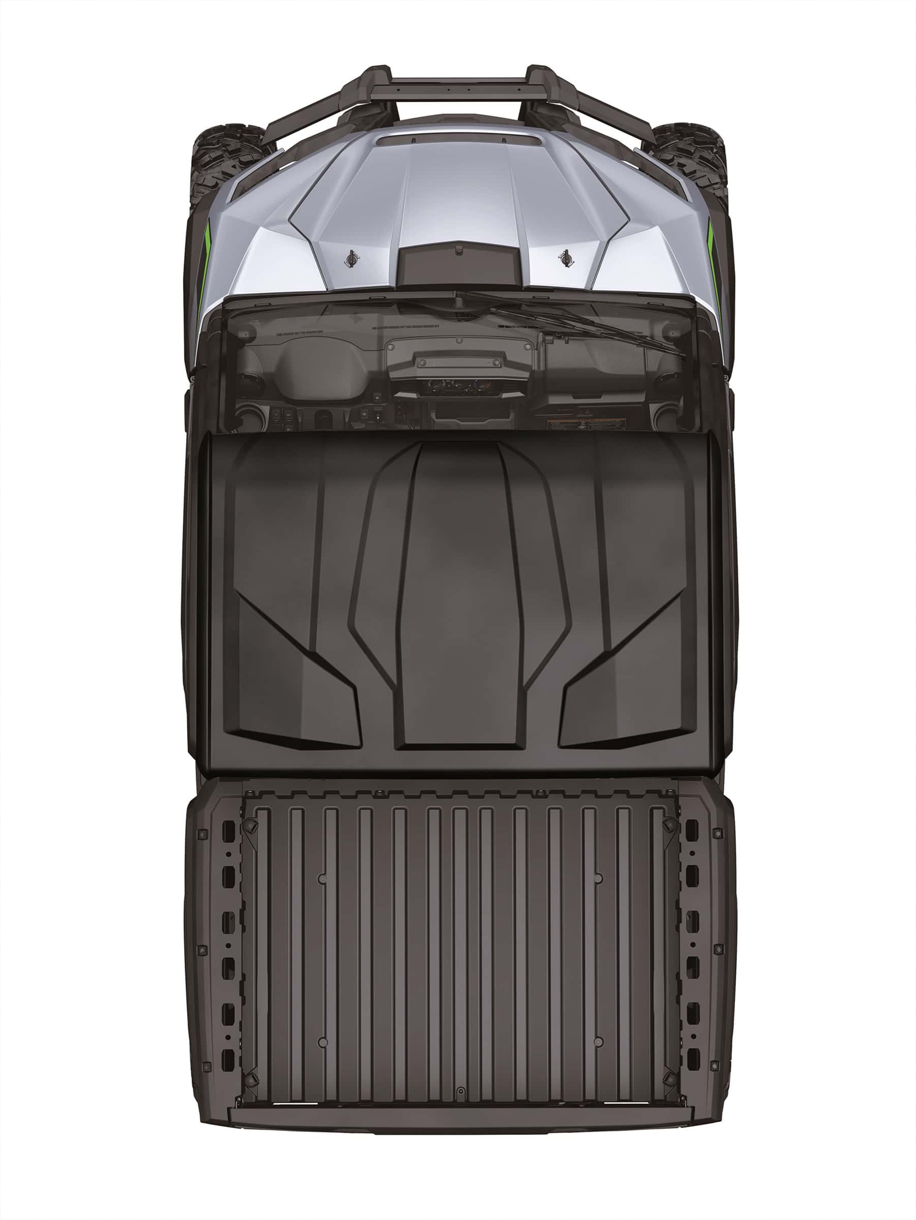 The cargo bed, measuring 35 x 49 x 12.8-inches with a load capacity of 1,000 lbs. is designed for substantial loads. Its flat design facilitates loading from three sides, and in models without a full cab, the cargo bed can be accessed from the cabin. Four built-in hooks provide convenient tie-down points.
