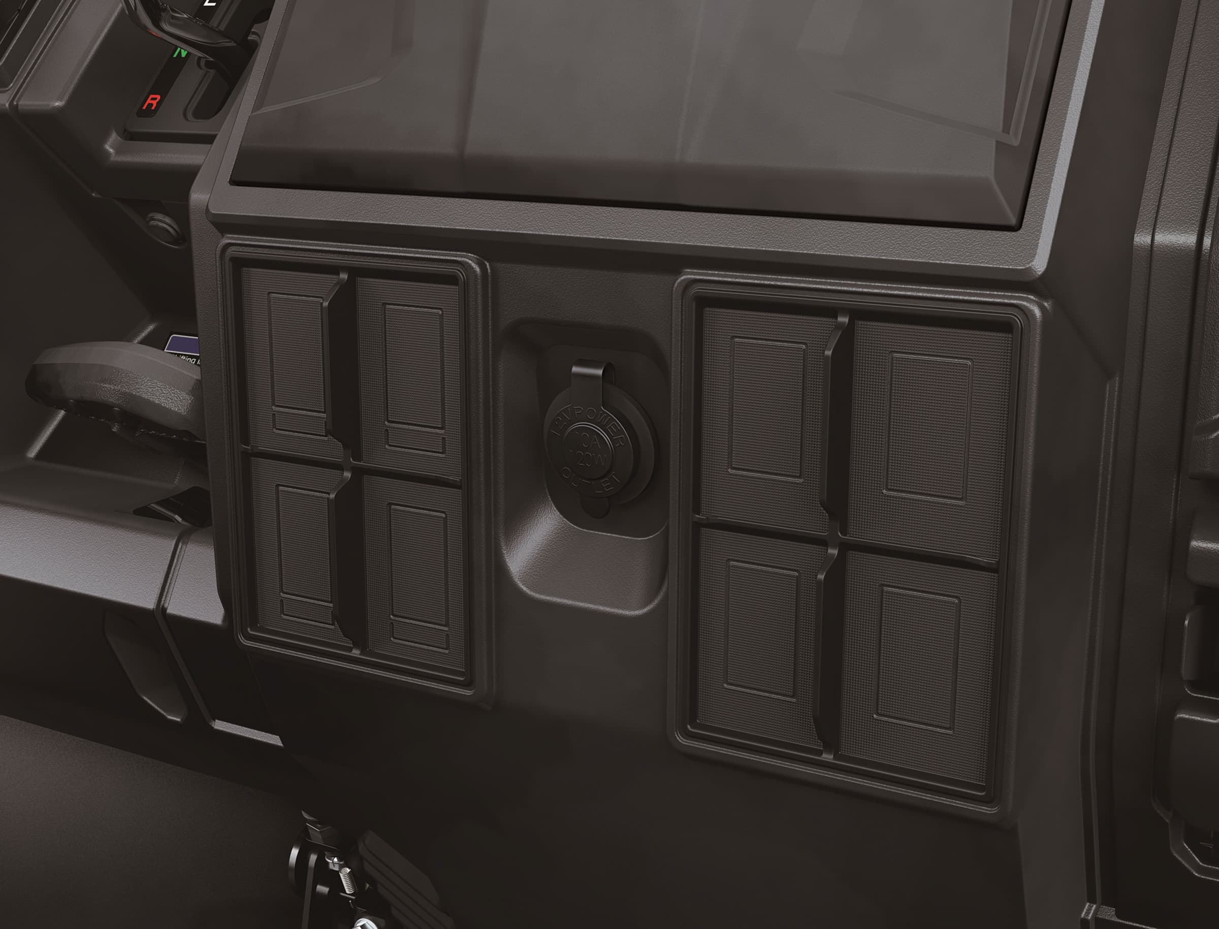 The RIDGE XR offers ample enclosed storage options for small items within the dashboard. These include three covered compartments: a lidded compartment above the dashboard center console (featured on non-HVAC models), a passenger-side glove box, and another lidded compartment above the glove box. Additionally, a convenient pocket in the dashboard center console provides easy-access storage for small items. The left and right sides of the dashboard house two large cup holders designed to accommodate 30oz. cups with handles.