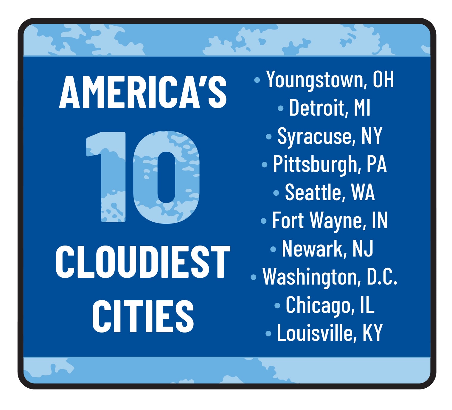 2. The data pulled by The Weather Channel comes from over 600 cities and nearly 22,000 data points. Cloud cover was ranked based on daily record keeping from sunrise to sunset over a three-year period (January 2019 – December 2021). Please note: This list has been filtered to limit the number of cities per state to one, featuring the cloudiest city in each represented state (including the District of Columbia).