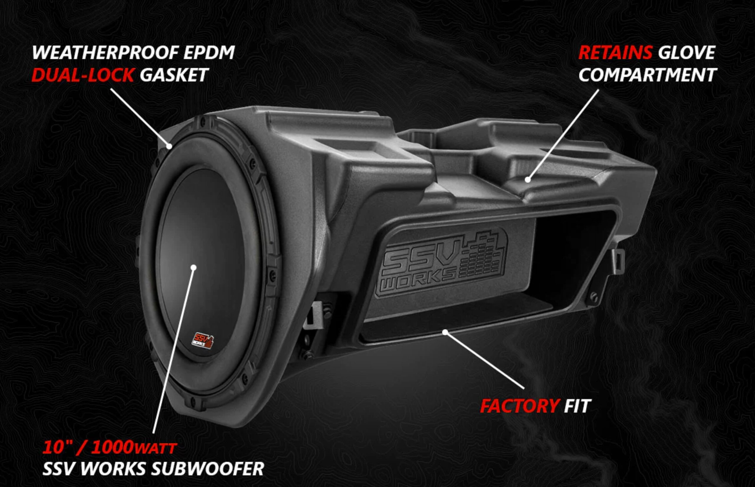 “With a thumping 1,000 Watt MAX (500 Watt RMS) SSV Works V-Series subwoofer, these kits are a perfect and easy add-on to select Polaris models that come with stock factory audio that don’t include subwoofers,” explained Trevor Kaplan, SSV Works CEO. “Complete with pre-installed subwoofer, subwoofer enclosure, 500-watt Kicker mono amp, and plug-&-play wiring, these SSV Works kits add deep, clean bass to your system and could not be easier to install.”